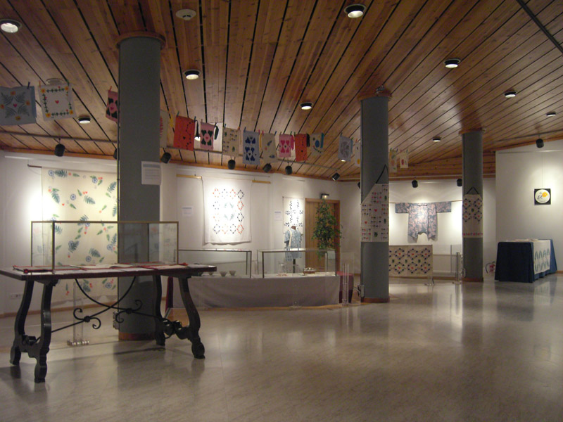 A su vera están las vitrinas, y al fondo está colgada lo que queda de una colcha de Biescas, famosas en la tradición de la villa, puesto que en el s.XIX casi todas las casas tenían su telar y su tintorería.
