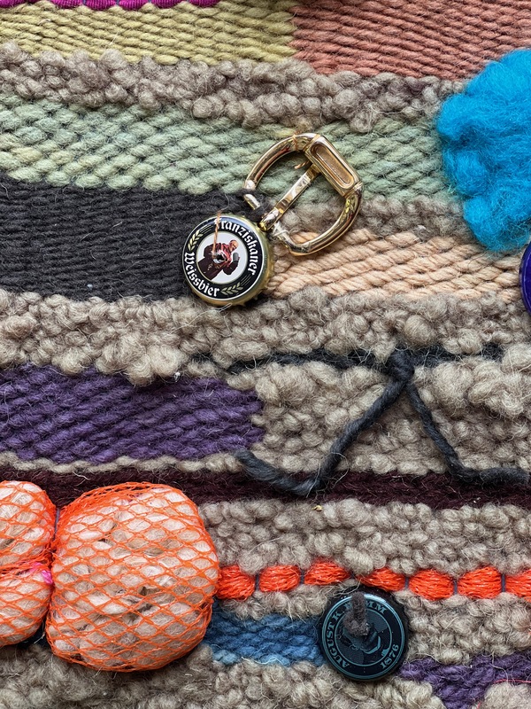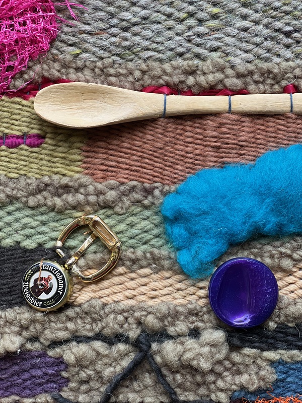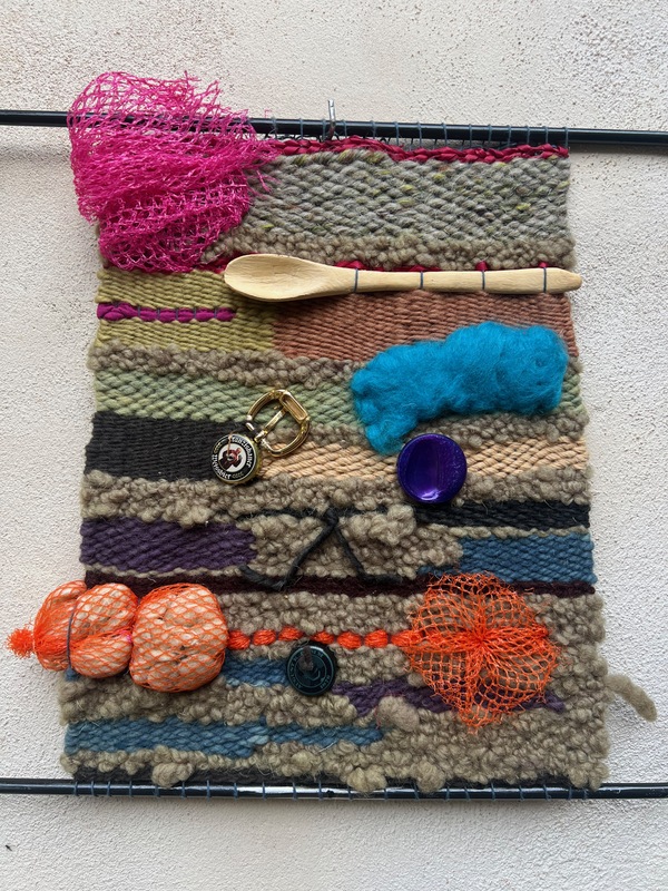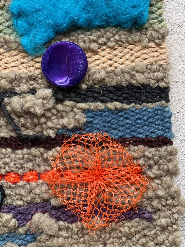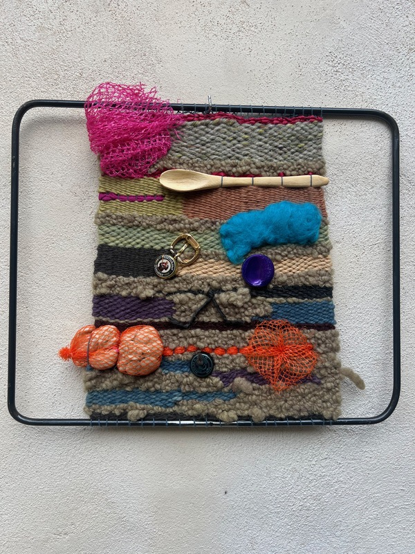 Realizado con lana en la trama y algodón en la urdimbre. Contiene mallas de plástico, botones, una cuchara de palo de boj, y abalorios diversos.