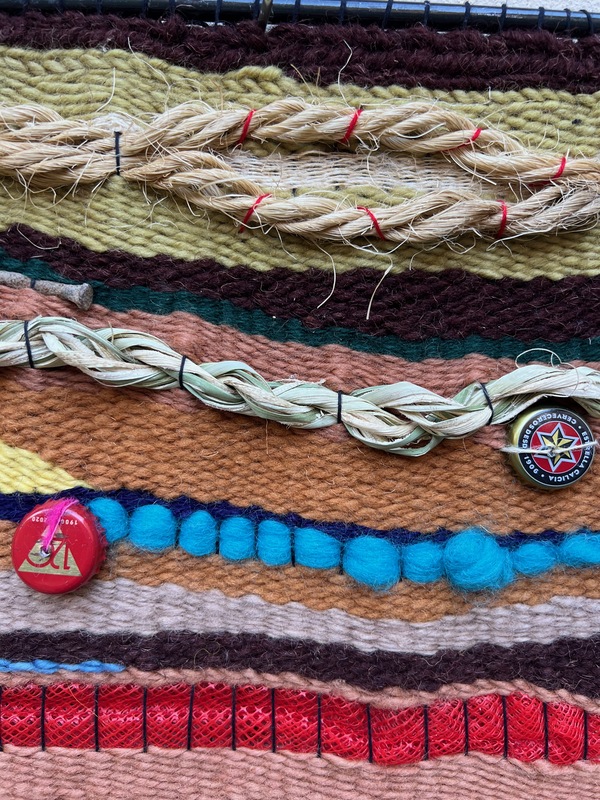 Está realizado sobre bastidor, en telar de alto lizo, con lanas teñidas a mano con tintes naturales, y trenzas de esparto, de enea, mallas de plástico, chapas, y otros abalorios.