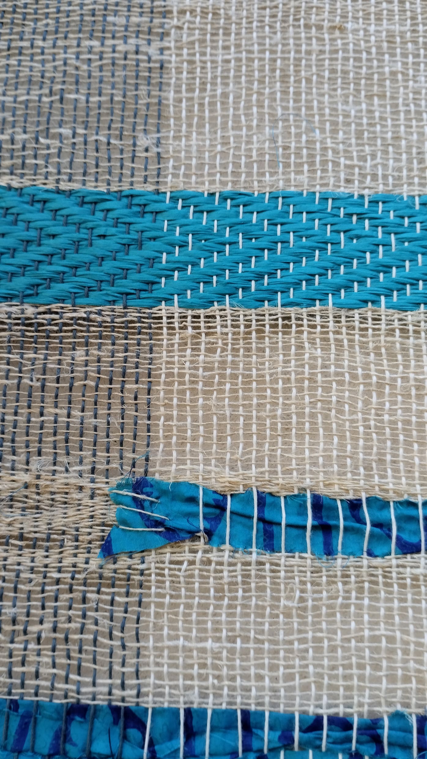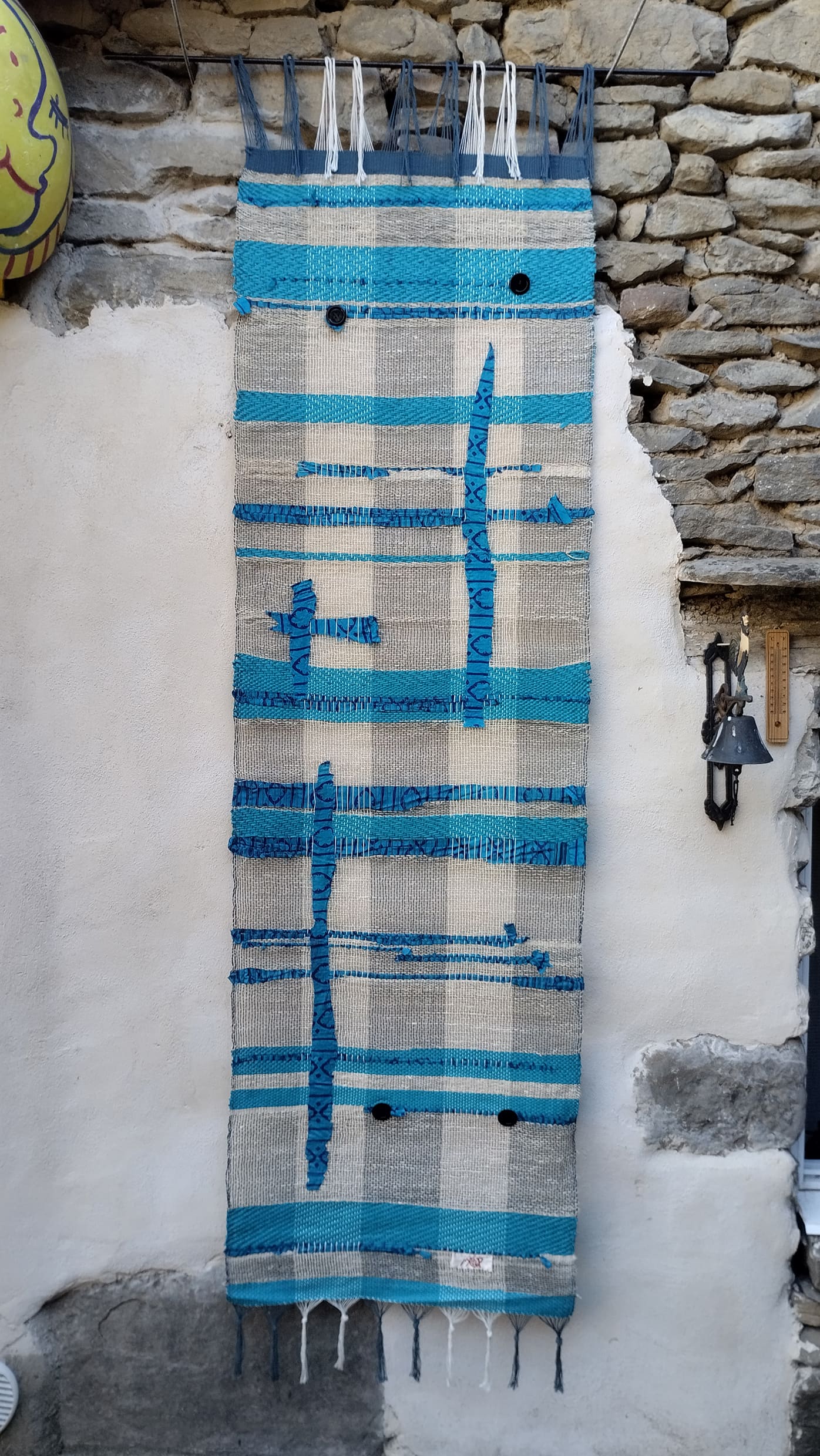 Además está tejido en telar de bajo lizo, con hilo de cáñamo hilado a mano, tejido de seda y rafia azul.