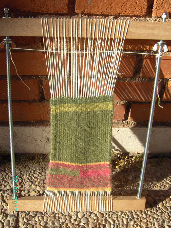 Aquí tenéis algunas de las piezas tejidas en bastidor, alto lizo, con lanas teñidas por mí el verano pasado en el pueblo. El verde es una mezcla del azul del Indigo y el amarillo del Tanaceto.